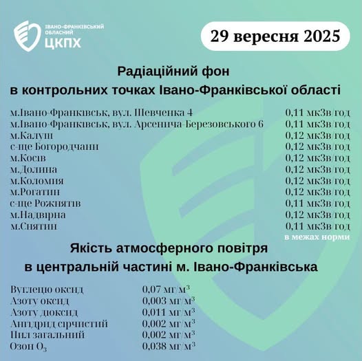 Станом на ранок 29.09.2025 показники радіаційного фону в Івано-Франківській області становлять від 0,11 мкЗв/год до 0,12 мкЗв/год, що не перевищує природний радіаційний фон характерний для Прикарпаття (0,32 мкЗв/год).