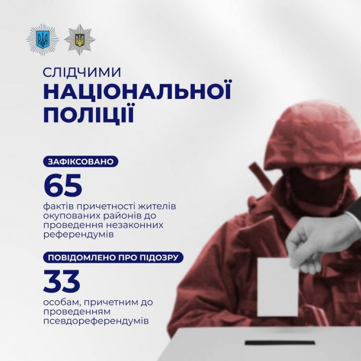 Слідчі Національної поліції повідомили про підозру за причетність до проведення псевдореферендумів у цих регіонах уже 33 особам.