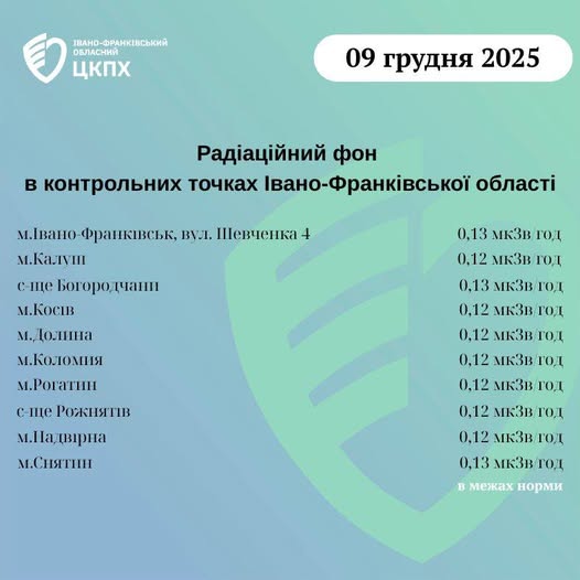 Станом на ранок 09.12.2025 показники радіаційного фону в Івано-Франківській області становлять від 0,12 мкЗв/год до 0,13 мкЗв/год, що не перевищує природний радіаційний фон характерний для Прикарпаття (0,32 мкЗв/год).