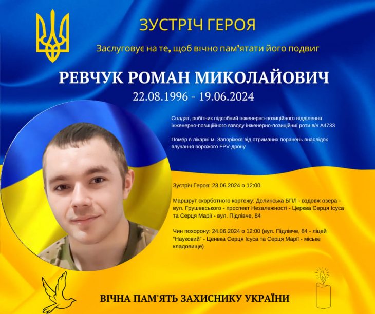 Сьгодні, 23 червня, о 12:00 годині Долинська громада зустріне полеглого солдата Романа Ревчука