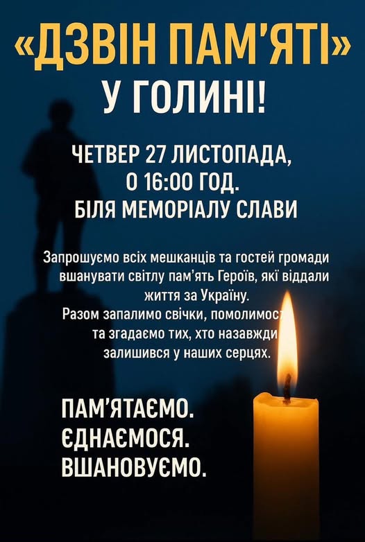У четвер, 27 листопада, громада Голиня збиратиметься біля Меморіалу Слави, щоб спільно вшанувати світлу пам’ять про Героїв, які віддали життя за Україну.
