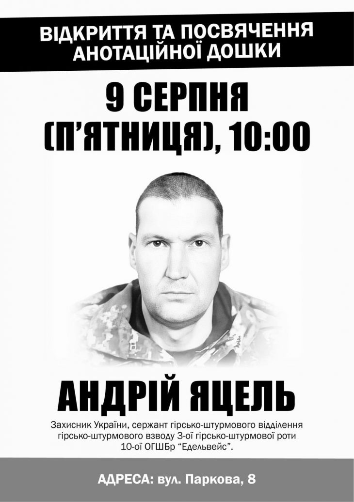 Цієї п’ятниці, 9 серпня, відкриють анотаційну дошку Герою Андрію Яцелю.