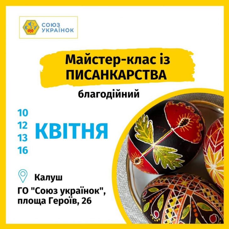 Також союзянки запрошують на майстерклас з розпису писанок 10,12,13 та 16 квітня.