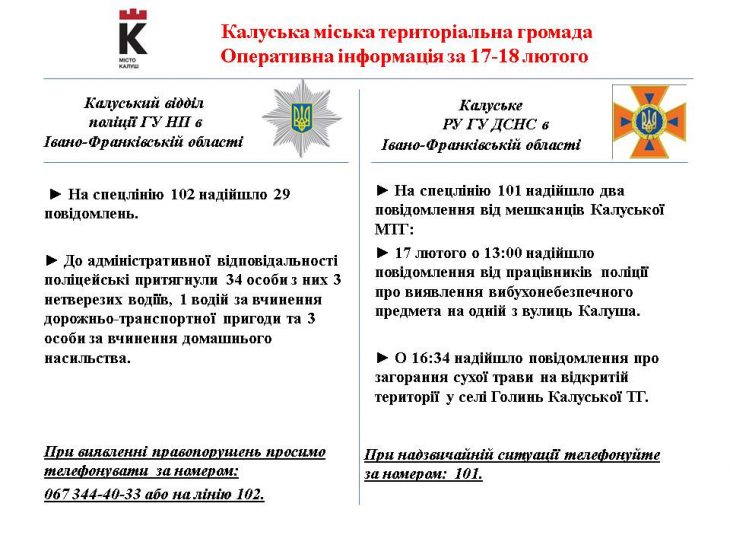 У Калуській громаді протягом 17-18 лютого на спецлінію 102 надійшло 29 повідомлень від мешканців