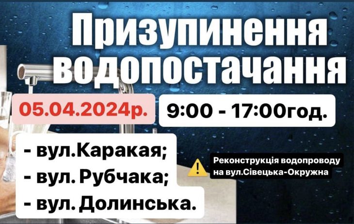 Водопостачання тимчасово призупиняється для проведення робіт з реконструкції водопровідної мережі на вулицях Сівецька – Окружна.