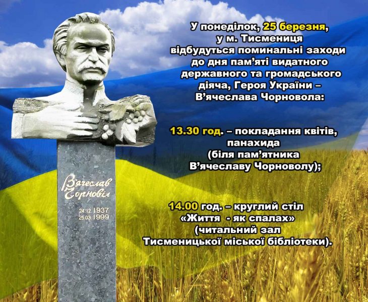 У понеділок, 25 березня, у м. Тисмениця відбудуться поминальні заходи до дня пам’яті видатного державного та громадського діяча, Героя України – В’ячеслава Чорновола.