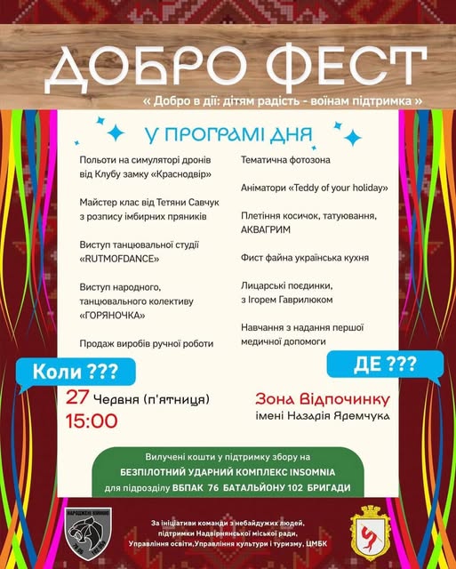 Сьогодні о 15:00 год на зоні відпочинку відбудеться Ярмарок на підтримку 76 батальйону 102 окремої бригади Сил територіальної оборони ЗСУ з метою придбання безпілотного ударного комплексу INSOMNIA.