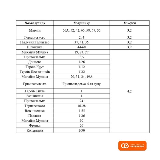 Для мешканців вулиць, чиї адреси будинків вказані на прикріпленому фото, черга 1.2 зміниться на черги 3.2 та 4.2 (також вказано на фото).