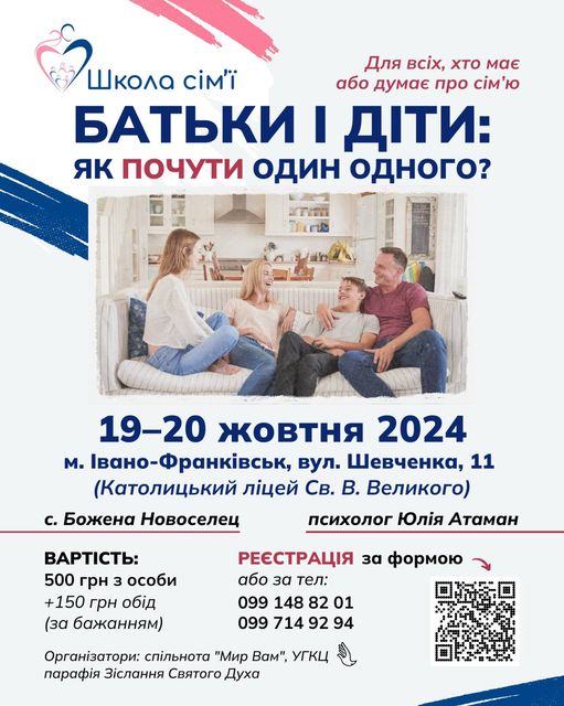 Такі навчання відбудуться у рамках циклу конференцій «Школа сім’ї», які організовує спільнота «Мир Вам», що діє при парафії Зіслання Святого Духа Центрального протопресвітеріату м. Івано-Франківськ.