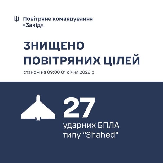 Авіація та підрозділи протиповітряної оборони повітряного командування «Захід» в зоні своєї відповідальності знищили 27 ударних БПЛА типу «Shahed».