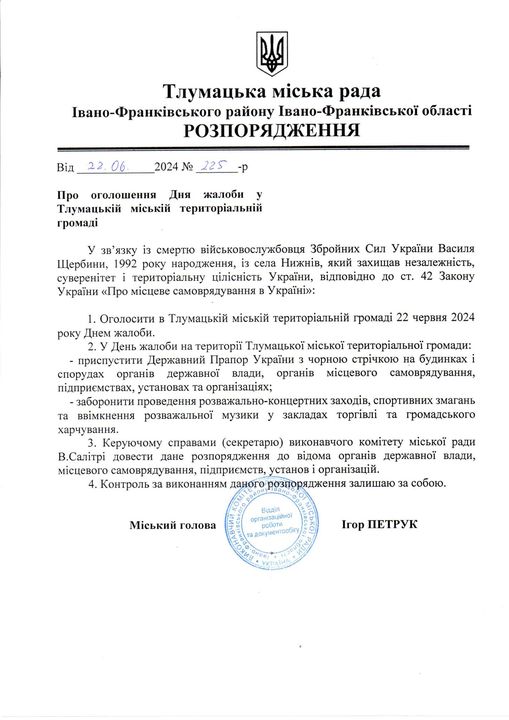 Розпорядження “Про оголошення Дня жалоби в Тлумацькій міській територіальній громаді”.