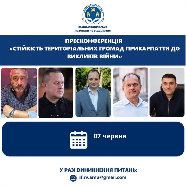 7 червня, у п’ятницю, відбудеться пресконференція з ініціативи Івано-Франківського регіонального відділення Асоціації міст України на тему «Стійкість територіальних громад Прикарпаття до викликів війни»