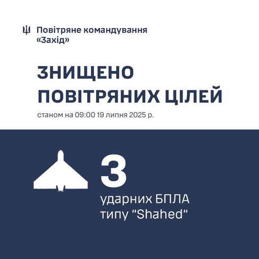 Підрозділи протиповітряної оборони повітряного командування «Захід» в зоні своєї відповідальності знищили 3 ударних БпЛА типу «Shahed».