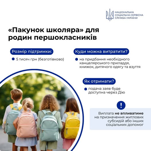 Допомога призначена для родин, чиї діти йдуть до першого класу в очному форматі. Розмір виплати становитиме – 5 тисяч гривень.