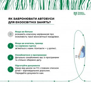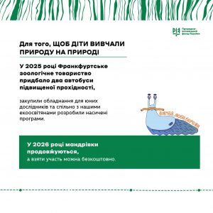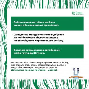 1. «Ріка Женець – чому варто її відвідати?»Відвідування водоспадів «Гук» та «Юрин», знайомство з географічними поняттями «річкова екосистема», «урочище», «каньйон». Розповідь про річку Женець, особливості життя гірських рік, їх значення для життя людини та споглядання для відвідувачів. Дослідження гідробіонтів та якості води.2. «Водно-болотні угіддя на вагу золота»Пізнавальна екскурсія на оліготрофне болото Рудяк.3. «Подорож заповідним краєм»Екскурс в історію карпатських перлин. Пошук Довбушевих скарбів.Це не всі екоосвітні програми. Щоб дізнатися більше – зв’яжіться з нами.Пан Слимак дуже любить мандрувати та навчатися з дітьми, тож поспішайте забронювати подорож. Екоосвітні уроки відбуваються за підтримки Франкфуртського зоологічного товариства.