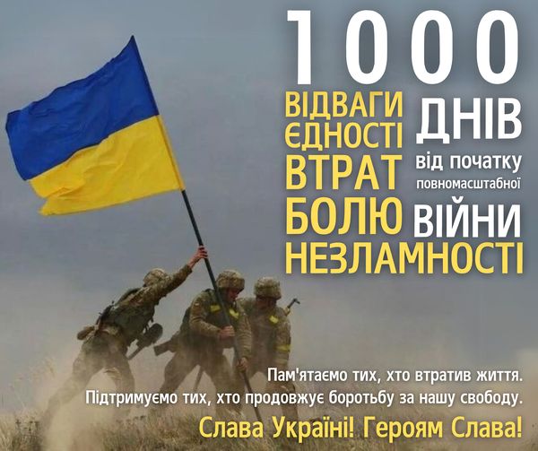 Ці 1000 днів стали випробуванням для кожного українця. Ми втратили тисячі життів наших воїнів і мирних громадян, частину територій, багато культурних пам’яток, освітніх і культурних закладів. Жорстока війна принесла невимовний біль, сльози та руйнування.