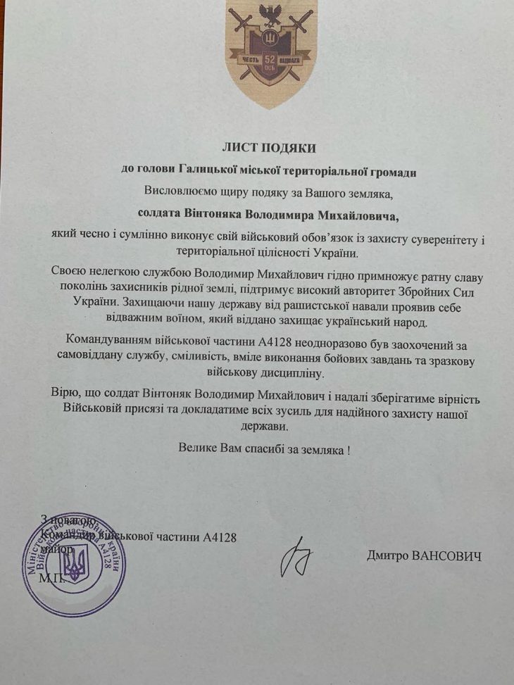 До Галицької громади вдруге прийшов лист подяки для воїна Володимира Вінтоняка