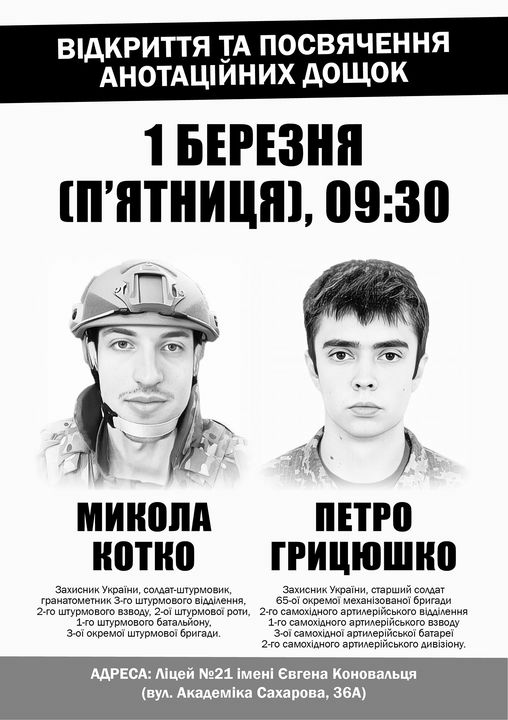 Завтра, 1 березня, відбудеться відкриття двох анотаційних дощок загиблим Захисникам України Миколі Коротко та Петру Грицюшко. Пише Голос-Інфо з посиланням на Івано-Франківська міська рада Микола Коротко солдат-штурмовик, гранатометник 3-го штурмового […]