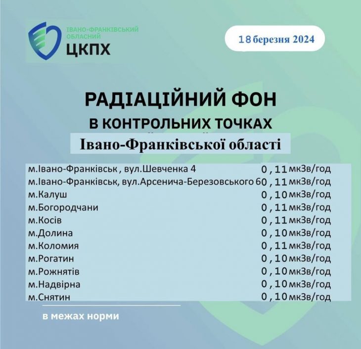 Станом на 18.03.2024 показник радіаційного фону становить від 0,10 мкЗв/год до 0,11 мкЗв/год (що не перевищує природний радіаційний фон для Прикарпаття в межах 0,32 мкЗв/год) Пише Голос-Інфо з посиланням на Івано-Франківський […]