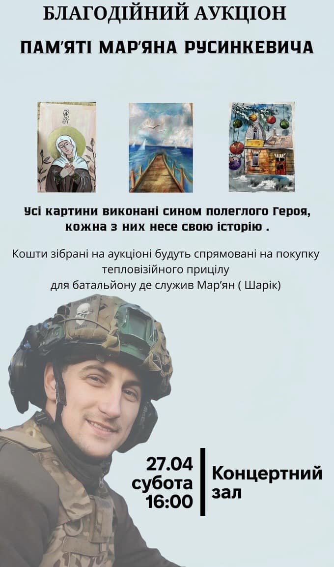 У суботу, 27 квітня, у Концертній залі о 16:00 відбудеться благодійний аукціон з продажу картин Матвія Русинкевича – сина Мар’яна Русинкевича – волелюбного Захисника, що віддав життя за Україну. Про […]