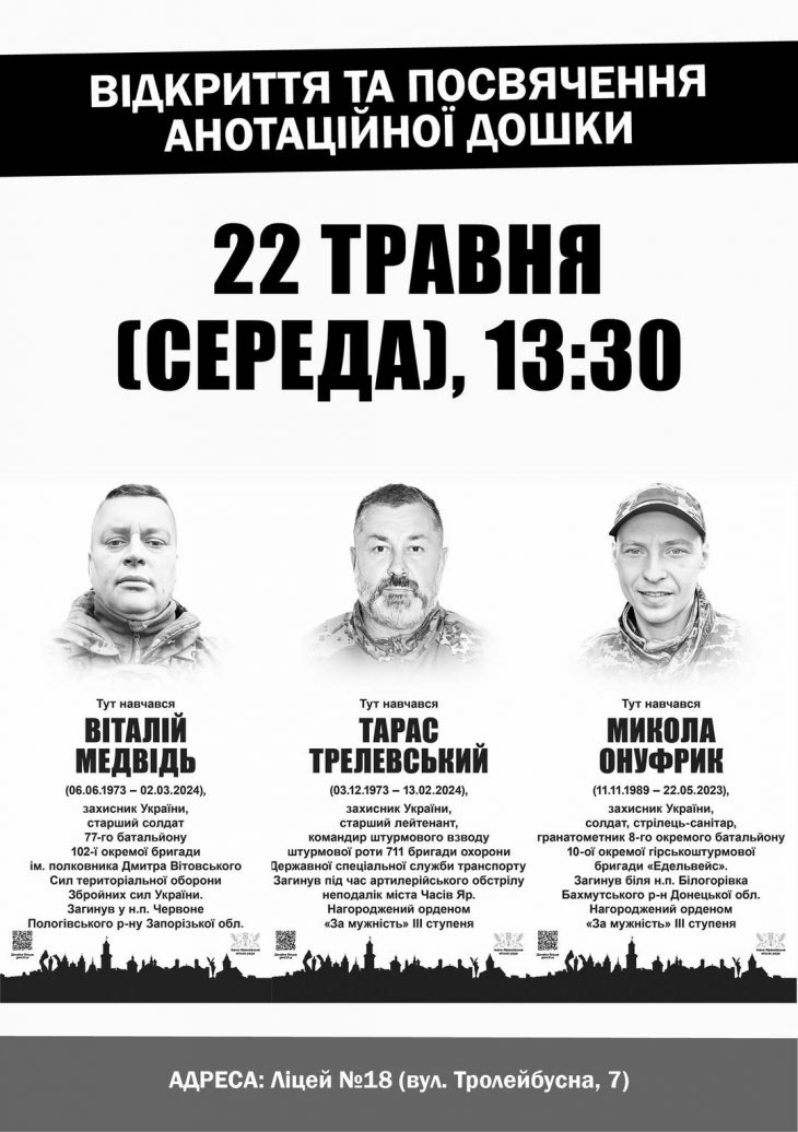 У середу, 22 травня у Івано-Франківську відкриють анотаційні дошки ще трьом Героям! Пише Голос-Інфо з посиланням на Руслана Марцінківа Віталій Медвідь, Тарас Трелевський, Микола Онуфрик віддали свої життя у боротьбі […]
