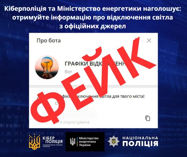 Кіберполіція та Міністерство енергетики наголошує: отримуйте інформацію про відключення світла з офіційних джерел