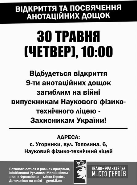 Івано-Франківський науковий фізико-технічний ліцей віддає шану своїм випускникам, що загинули захищаючи Україну! Пише Голос-Інфо, посилаючись на Івано-Франківську міську раду. Завтра, 30 травня 2024 року, о 10.00 год. відбудеться відкриття дев’яти […]
