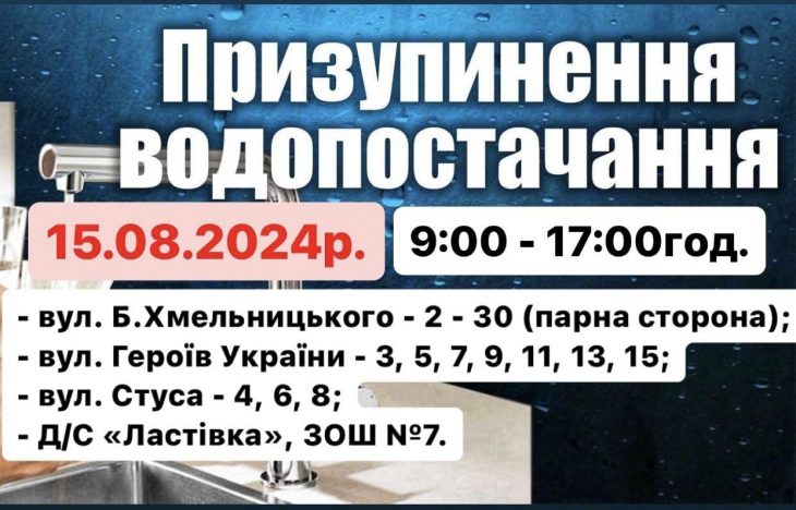 У Калуській громаді тимчасове призупинення водопостачання у четвер, 15.08.2024 року з 9:00 год. до 17:00 год. Пише Голос-Інфо з посиланням на Калуську міську раду Тимчасово без водопостачання: – вул. Б.Хмельницького […]