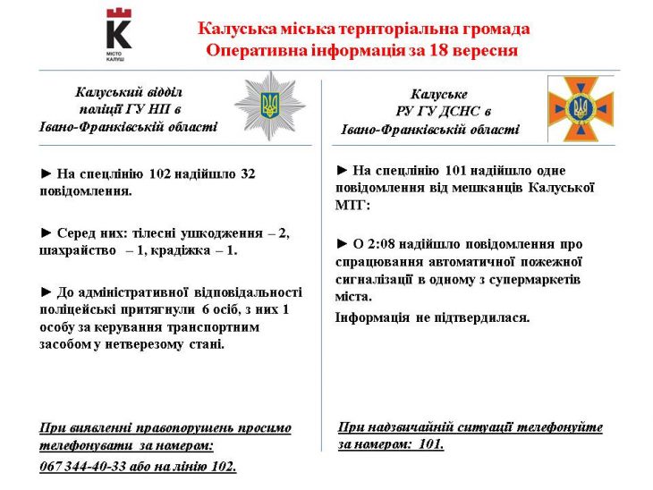 Протягом 18 вересня на спецлінію 102 надійшло 32 повідомлення від мешканців Калуської громади