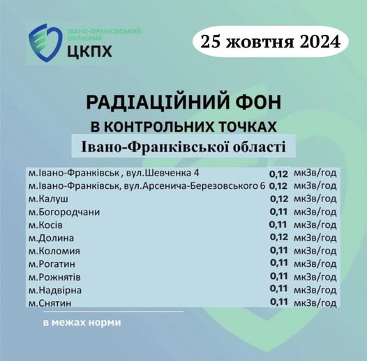 Станом на ранок 25.10.2024 показник радіаційного фону в Івано-Франківській області становив від 0,11 мкЗв/год до 0,12 мкЗв/год, що не перевищує природний радіаційний фон для Прикарпаття (в межах 0,32 мкЗв/год). Пише […]