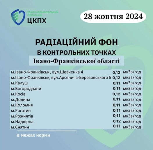 Станом на ранок 28.10.2024 показник радіаційного фону в Івано-Франківській області становив від 0,11 мкЗв/год до 0,12 мкЗв/год, що не перевищує природний радіаційний фон для Прикарпаття (в межах 0,32 мкЗв/год). Пише […]