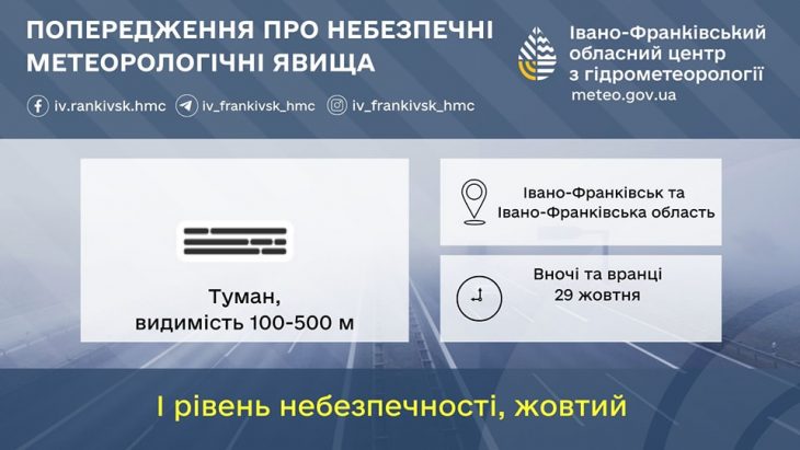 Попередження про небезпечне метеорологічне явище! Інформує Голос-Інфо, посилаючись на Івано-Франківський обласний центр з гідрометеорології Протягом ночі та ранку 29 жовтня по місту Івано-Франківську та області очікується туман ( видимість 100-500м […]