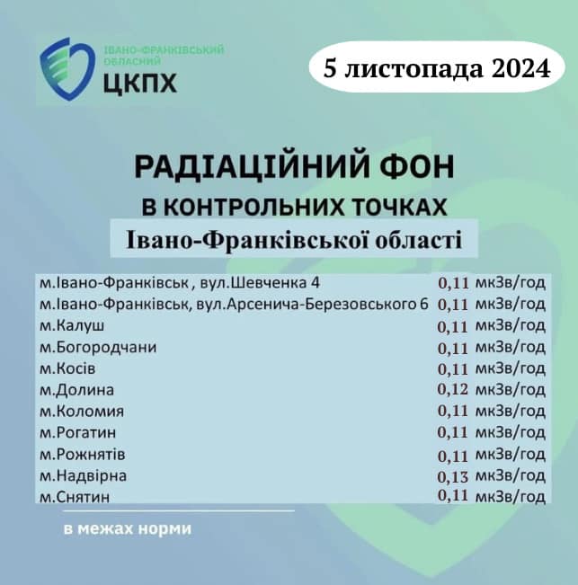 Станом на ранок 05.11.2024 показник радіаційного фону в Івано-Франківській області становив від 0,11 мкЗв/год до 0,13 мкЗв/год, що не перевищує природний радіаційний фон для Прикарпаття (в межах 0,32 мкЗв/год). Пише […]