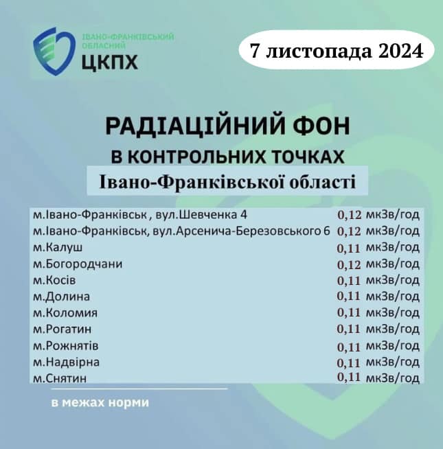 Станом на ранок 07.11.2024 показник радіаційного фону в Івано-Франківській області становив від 0,11 мкЗв/год до 0,12 мкЗв/год, що не перевищує природний радіаційний фон для Прикарпаття (в межах 0,32 мкЗв/год). Пише […]
