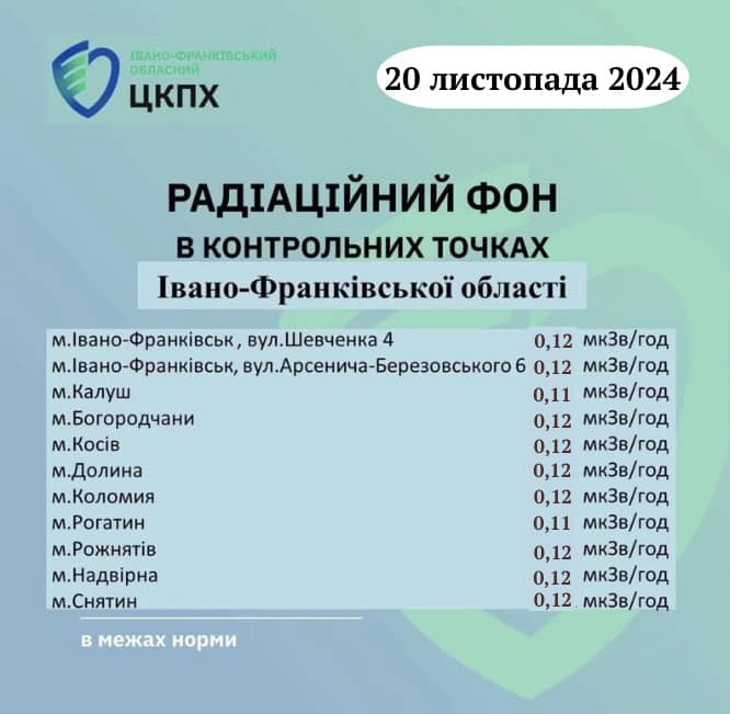 Станом на ранок 20.11.2024 показник радіаційного фону в Івано-Франківській області становив від 0,11 мкЗв/год до 0,12 мкЗв/год, що не перевищує природний радіаційний фон для Прикарпаття (в межах 0,32 мкЗв/год). Пише […]