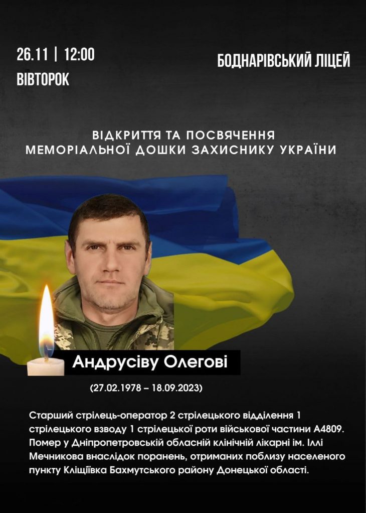 У Боднарові відбудеться відкриття та освячення інтерактивної меморіальної дошки полеглому Захисникові Олегові Андрусіву
