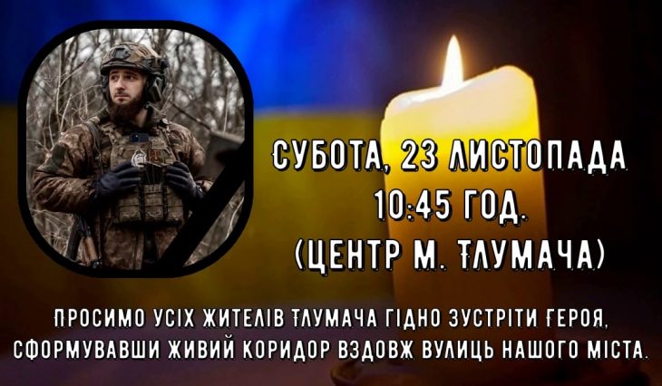 На Тлумаччину завтра, 23 листопада, привезуть тіло загиблого воїна – Василя Рибчина. Просять усіх жителів Тлумача гідно зустріти Героя, сформувавши живий коридор вздовж вулиць міста. Пише Голос-Інфо з посиланням на […]