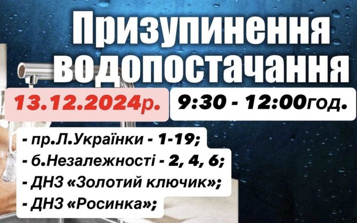 Тимчасове призупинення водопостачання, 13.12.2024 року з 9:30 до 12:00 години. Пише Голос-Інфо з посиланням на Калуську міську раду Тимчасово без водопостачання: пр.Л.Українки – 1-19; б.Незалежності – 2, 4, 6; ДНЗ […]