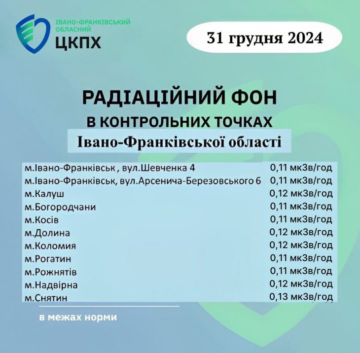 Станом на ранок 31.12.2024 показник радіаційного фону в Івано-Франківській області становив від 0,11 мкЗв/год до 0,13 мкЗв/год, що не перевищує природний радіаційний фон для Прикарпаття (в межах 0,32 мкЗв/год). Пише […]