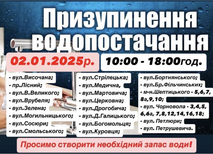 Тимчасове призупинення водопостачання у четвер 02.01.2025р. з 10:00год. до 18:00год. Пише Голос-Інфо з посиланням на Калуську міську раду Тимчасово без водопостачання: – вул.Височана; – пр.Лісний; – вул.В.Великого; – вул.Врубеля; – […]