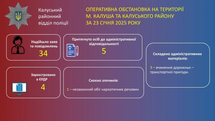Протягом 23 січня на спецлінію 102 надійшло 34 повідомлення від мешканців району, усі сигнали опрацьовані. Пише Голос-Інфо з посиланням на Поліцію Калущини Серед них: незаконний обіг наркотичних речовин – 1. […]