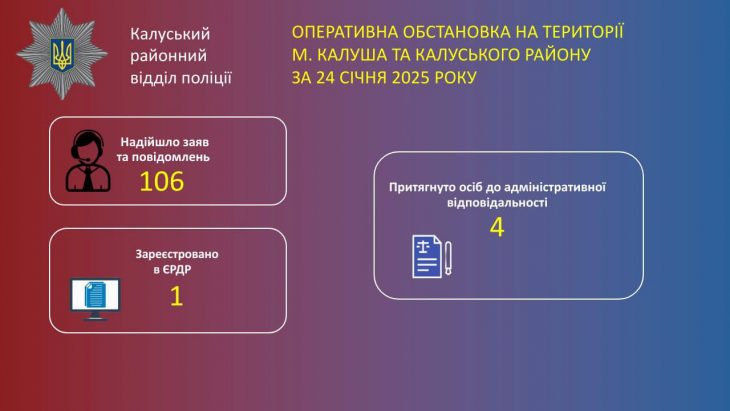 Протягом 24 січня на спецлінію 102 надійшло 106 повідомлень від мешканців району, усі сигнали опрацьовані. Пише Голос-Інфо з посиланням на Поліцію Калущини До адміністративної відповідальності поліцейські притягнули 4 осіб. Поліція […]
