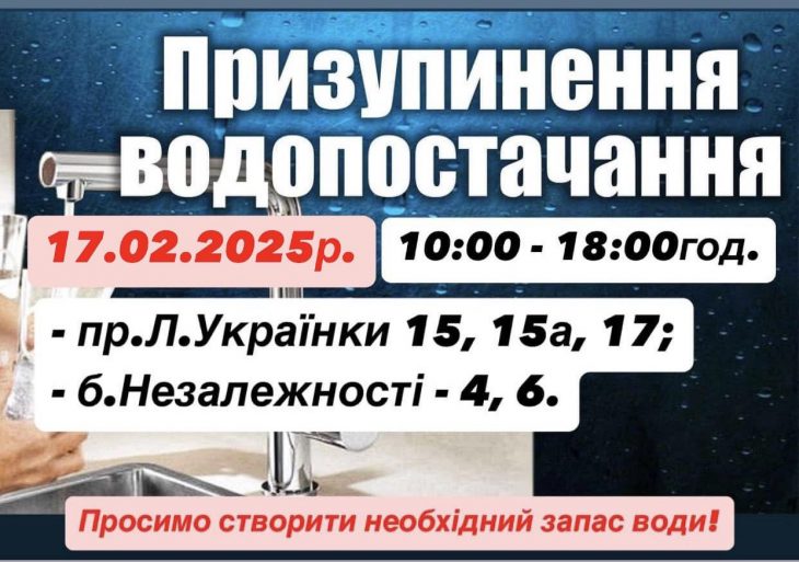 Тимчасове призупинення водопостачання у понеділок 17.02.2025р. з 10:00год. до 18:00год. Пише Голос-Інфо з посиланням на Калуську міську раду Тимчасово без водопостачання: пр.Л.Українки 15, 15а, 17; б.Незалежності – 4, 6. Водопостачання […]