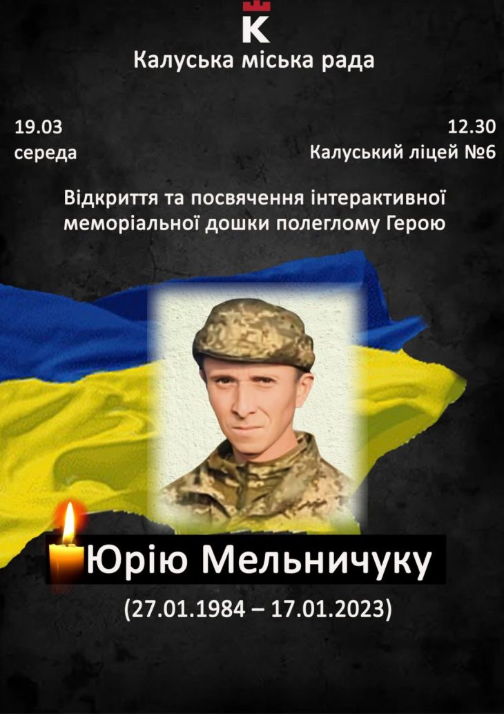 У Калуші відбудеться відкриття інтерактивної меморіальної дошки полеглому у російсько-українській війні Герою Юрію Мельничуку (27.01.1984 — 17.01.2023). Пише Голос-Інфо з посиланням на Калуську міську раду Солдат був призваний на службу […]