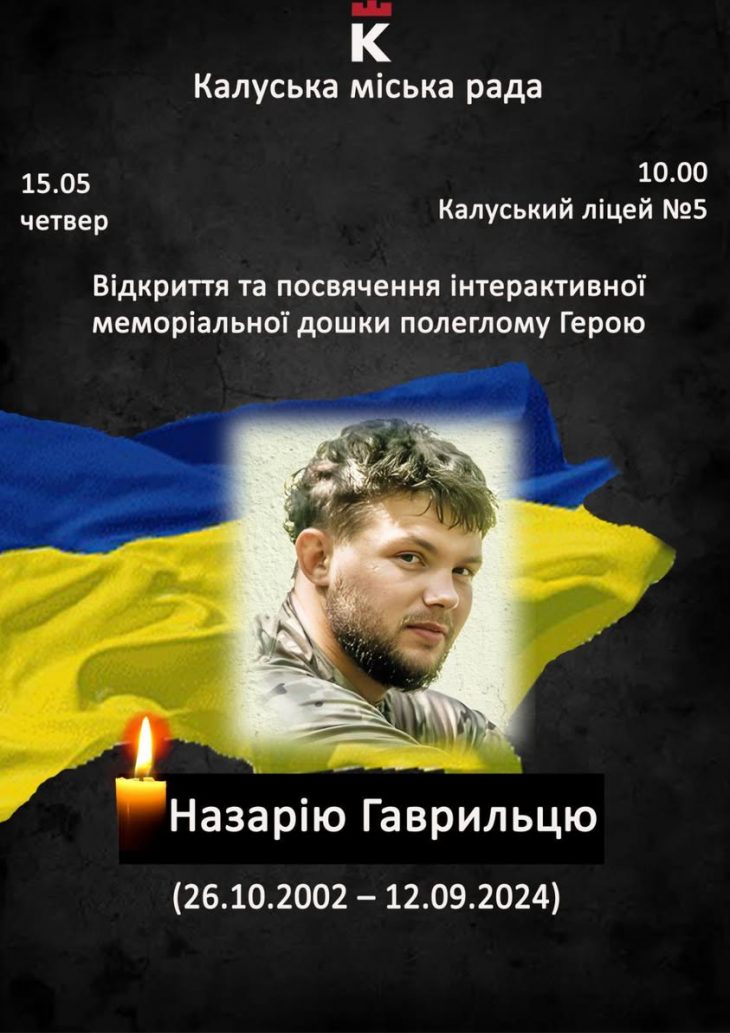 У четвер, 15 травня, о 10:00 на фасаді Калуського ліцею №5 відкриють меморіальну дошку Назарію Гаврильцю (26.10.2002 – 12.09.2024). Пише Голос-Інфо з посиланням на Андрія Найду Назарій Гаврилець у мирному […]