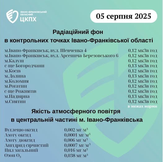 Станом на ранок 05.08.2025 показники радіаційного фону в Івано-Франківській області становлять від 0,12 мкЗв/год до 0,13 мкЗв/год, що не перевищує природний радіаційний фон характерний для Прикарпаття (0,32 мкЗв/год). Пише Голос-Інфо, […]