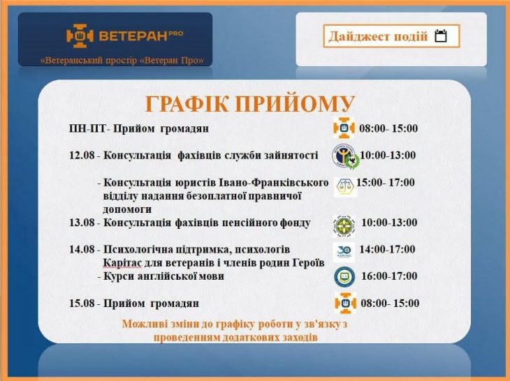 Івано-Франківський обласний ветеранський простір “Ветеран ПРО” оприлюднив розклад консультацій та зустрічей на 12–15 серпня. Пише Голос-Інфо, посилаючись на Івано-Франківську обласну державну адміністрацію ПН–ПТ — прийом громадян з 08:00 до 15:00. […]