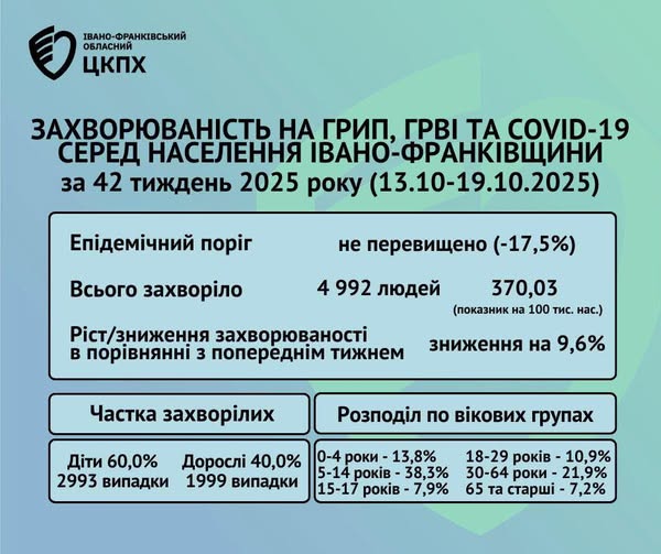 За даними оперативної інформації протягом 42 тижня 2025 року (епідсезон 2025-2026 рр.) на ГРВІ, грип та COVID-19 захворіло 4992 особи, із них 2993 особи діти 0-17 років (60,0%). У тому […]