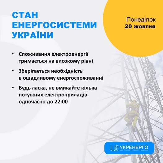 СТАН ЕНЕРГОСИСТЕМИ -Споживання електроенергії тримається на високому рівні -Зберігається необхідність в ощадливому енергоспоживанні -Будь ласка, не вмикайте кілька потужних електроприладів одночасно до 22:00 Пише Голос-Інфо, посилаючись на НЕК “Укренерго” НАСЛІДКИ […]