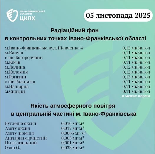 Станом на ранок 05.11.2025 показники радіаційного фону в Івано-Франківській області становлять від 0,11 мкЗв/год до 0,12 мкЗв/год, що не перевищує природний радіаційний фон характерний для Прикарпаття (0,32 мкЗв/год). Пише Голос-Інфо, […]